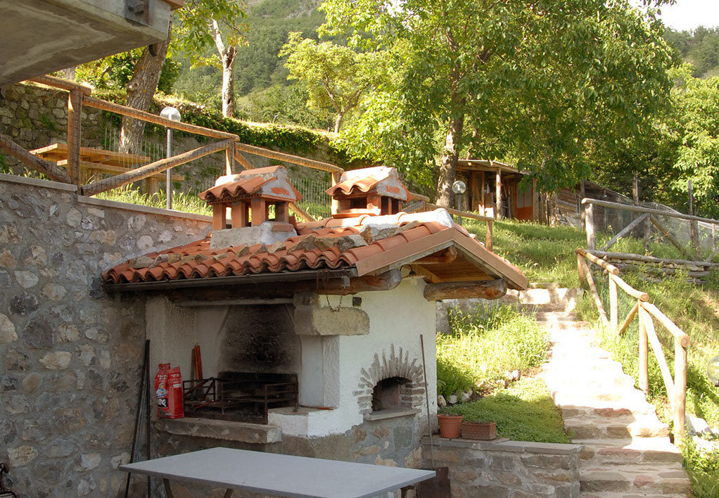 Forno a legna e barbecue e tavolini per un pranzo all'aperto.